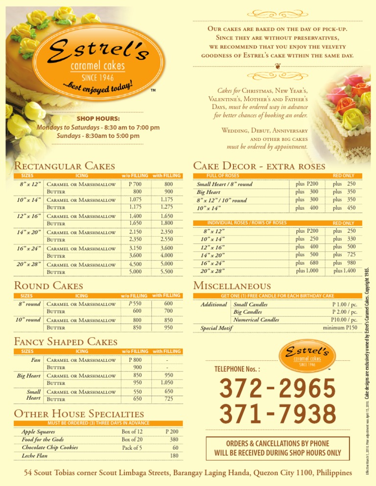 Menu price list 2019 of estrel s caramel cakes quezon city metro manila philippines.